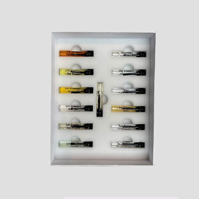 Tout l’univers olfactif des parfums LES ECUADORS avec des petites fioles de parfum magique.